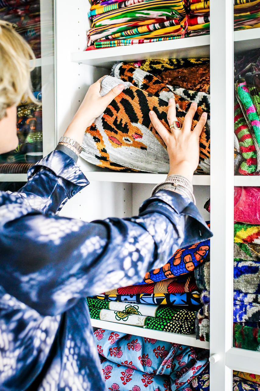 Textile, in particular, has been a constant in the artist's practice. Her strong belief that textile is significant to all of us, reminds us that we are born into it, we sleep in it, we eat on it, we define ourselves by it, we shield ourselves with it, and eventually, we die in it. While it unites us, it also divides us physically and symbolically. Her work broadens into immersive installations utilizing light and pattern to move past language and offer an expansive, experiential understanding of self, culture, and nation.