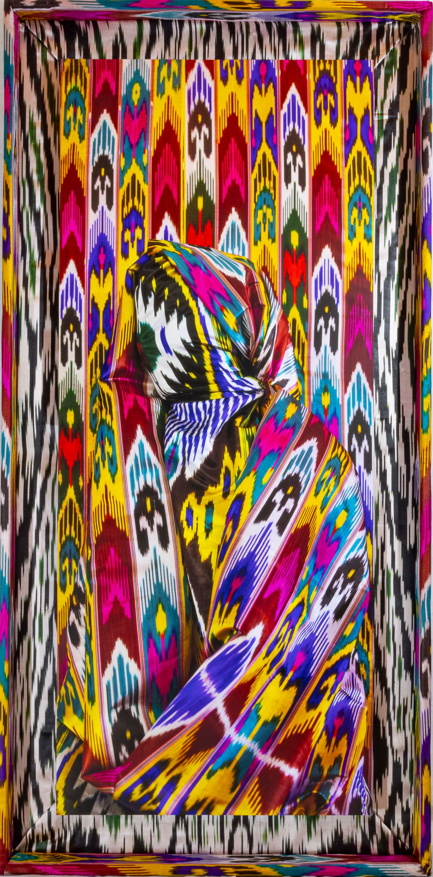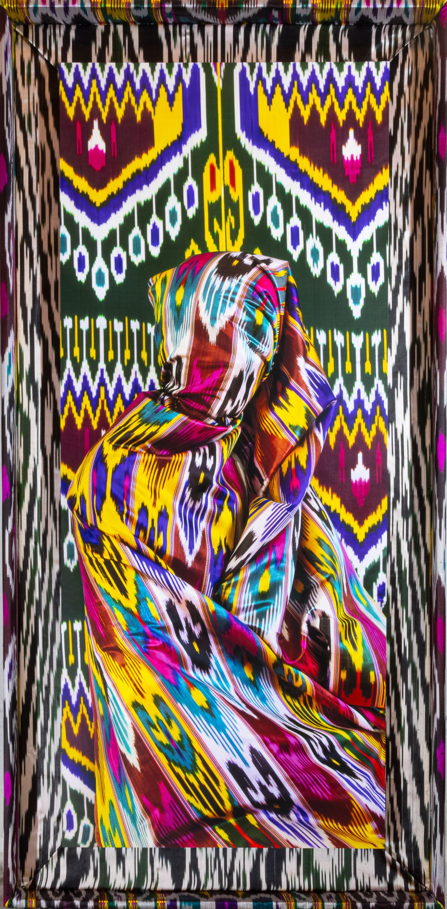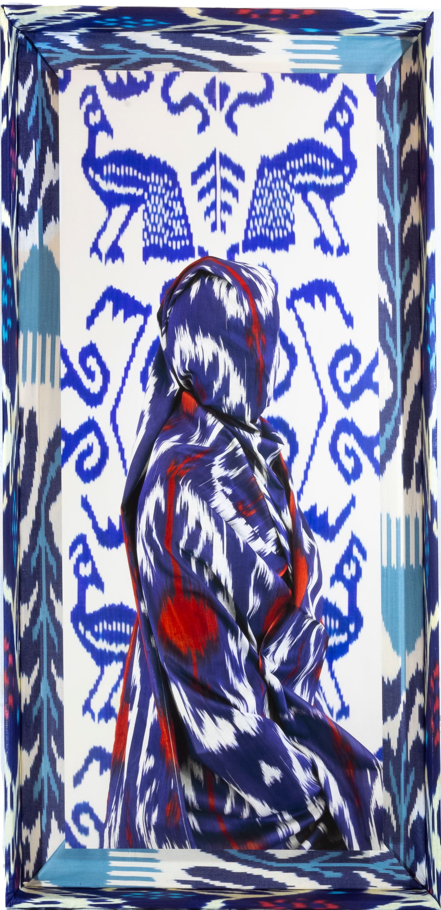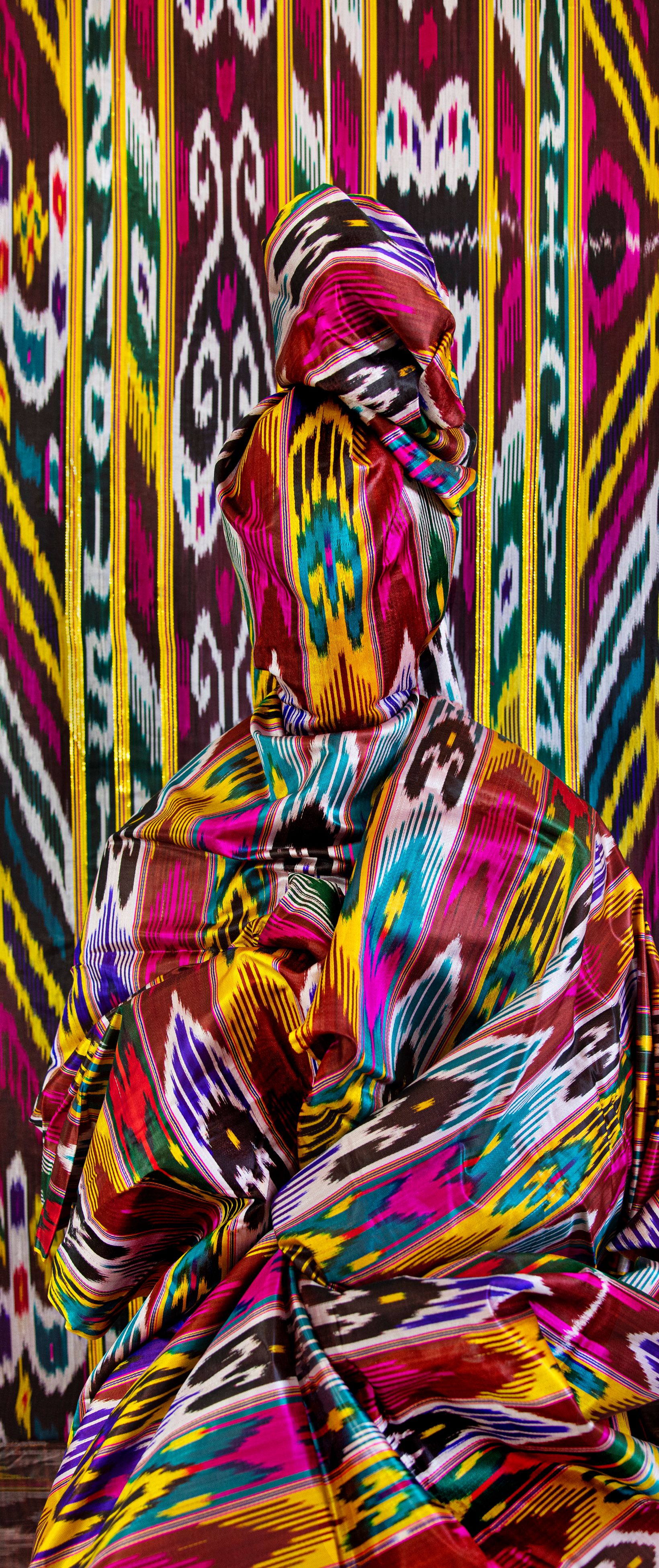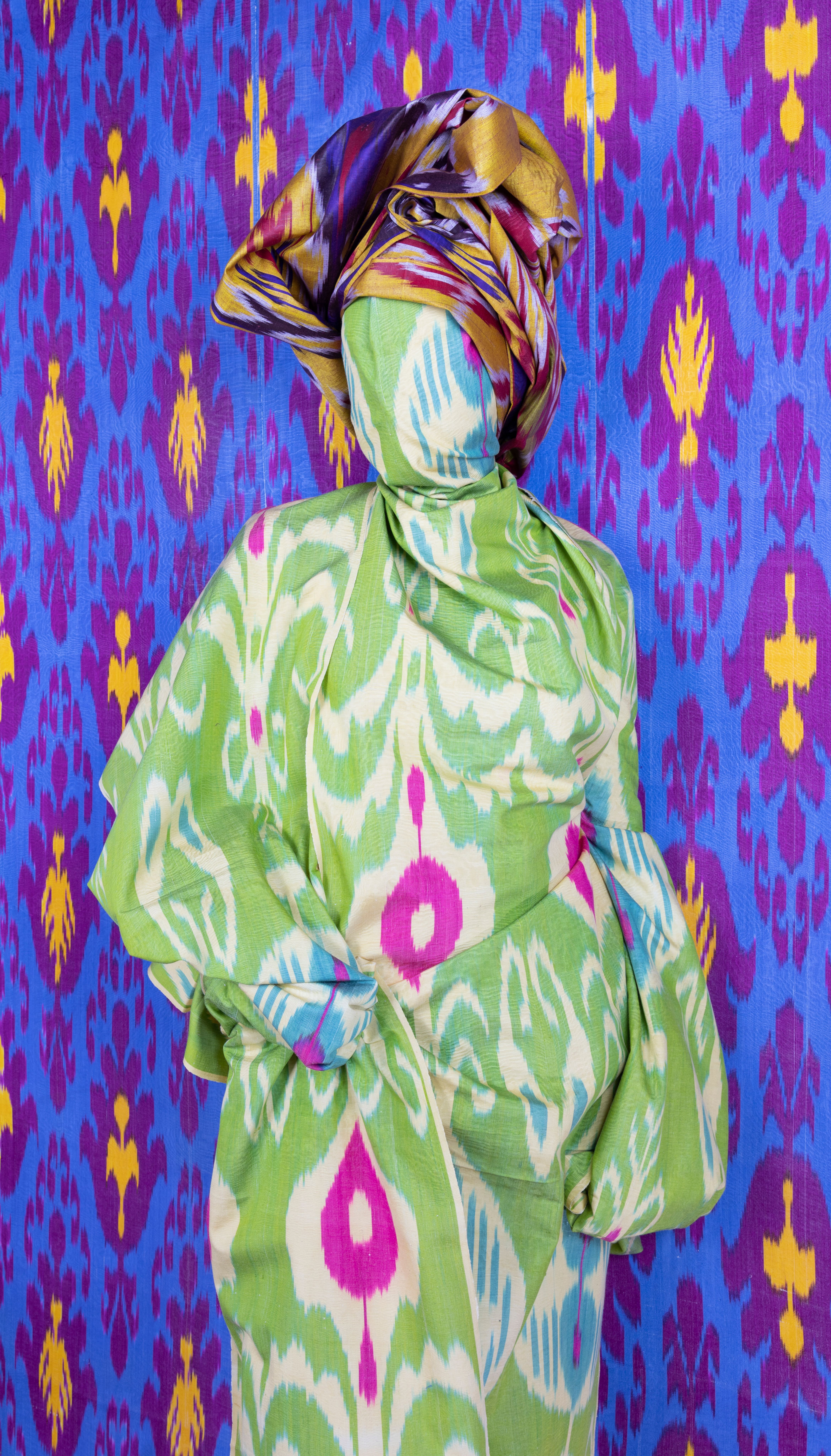 Today, Margilan is a sleepy town that attracts occasional tourists who make their way off the beaten track, away from the more renowned Samarkand and Bukhara. Its last claim to fame was in 2013, when the celebrated fashion designer Oscar de la Renta sourced fabrics here for his Fall 2013 collection. Though the kaleidoscopic designs of versicolored textiles took the fashion industry by storm, Margilan remains unchanged. The fashion industry’s appropriation of the pattern continued, while its origin was confused and co-opted as something other than Uzbek. Ikat-tiraz has been alarmingly removed from its source(s), and as such is widely recognized to be associated primarily with “Eastern'' cultures. In many instances, when searching online for example, ikat is often misattributed to Turkey or Morocco, when in fact the source lies in Uzbekistan. Ultimately, FLOW and IKATIKAT remind the viewer of where the fabric did originate, and signify the unseen master artisans themselves.