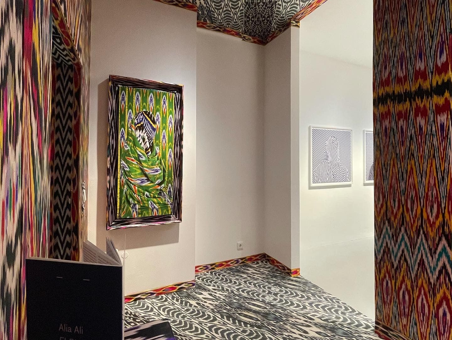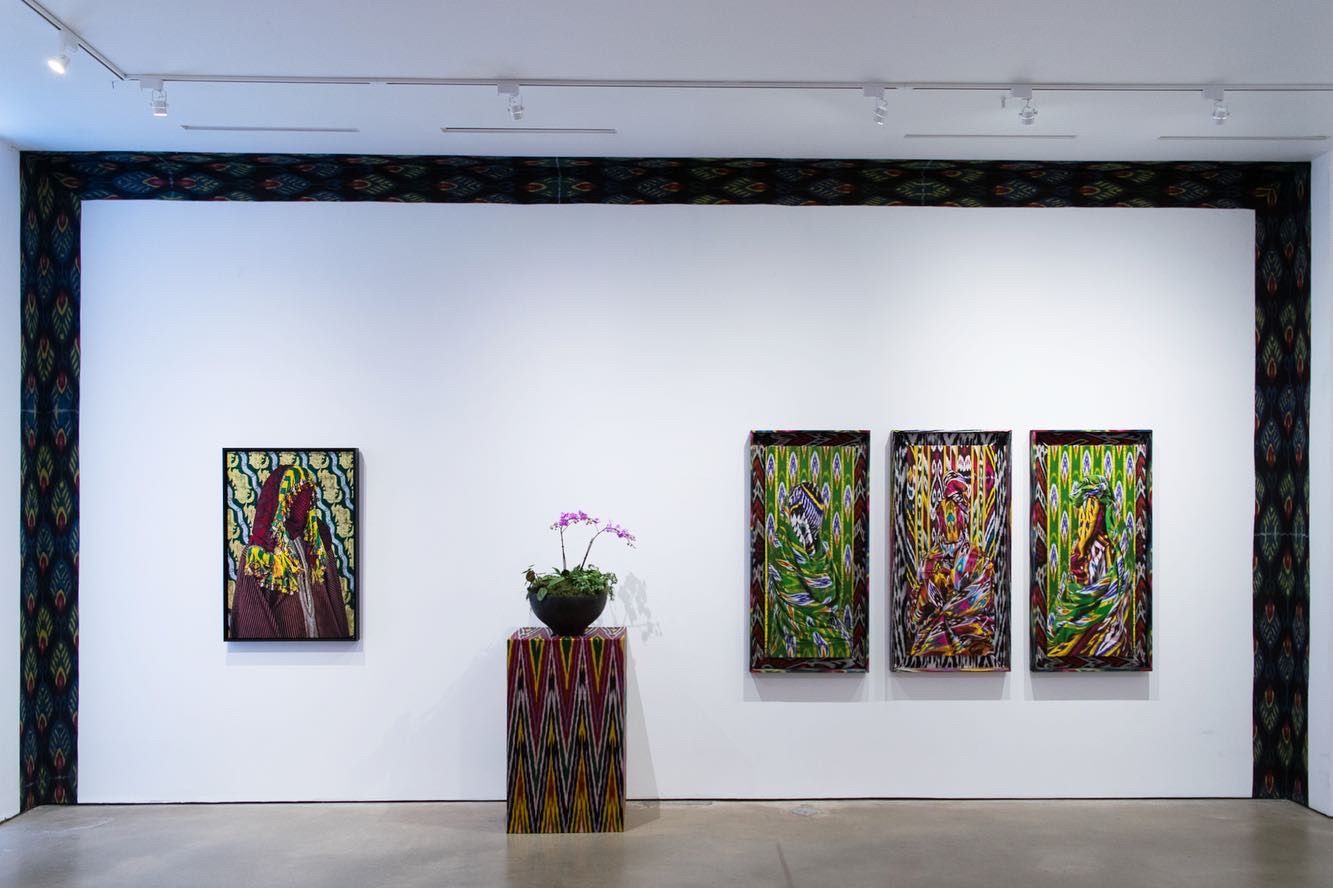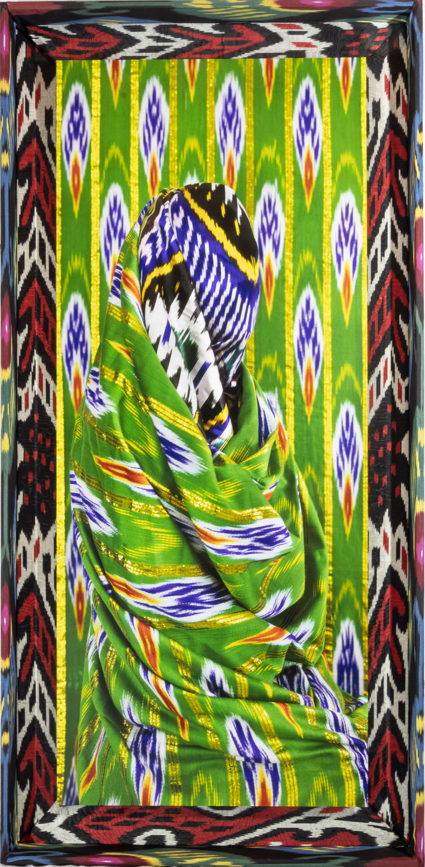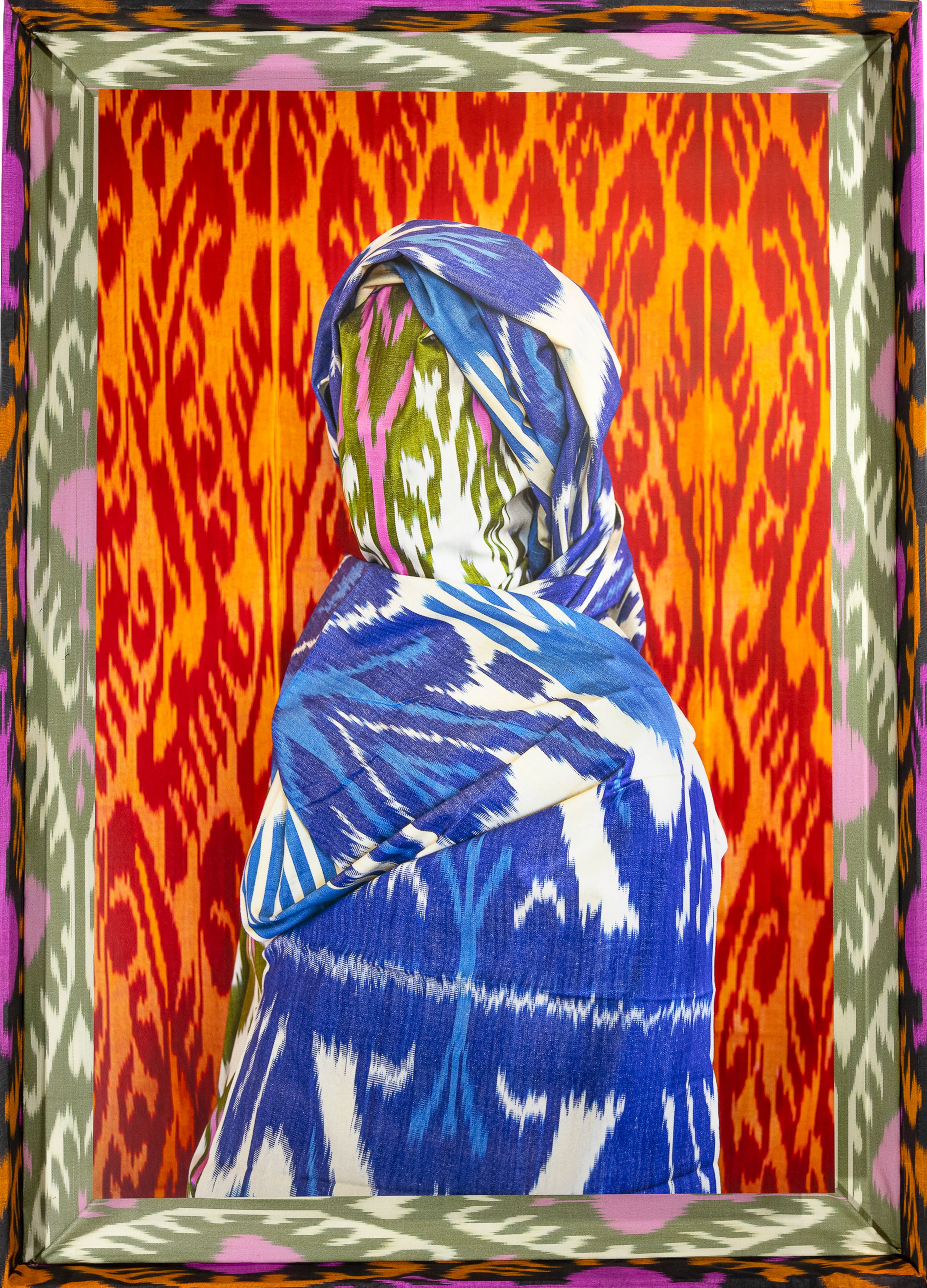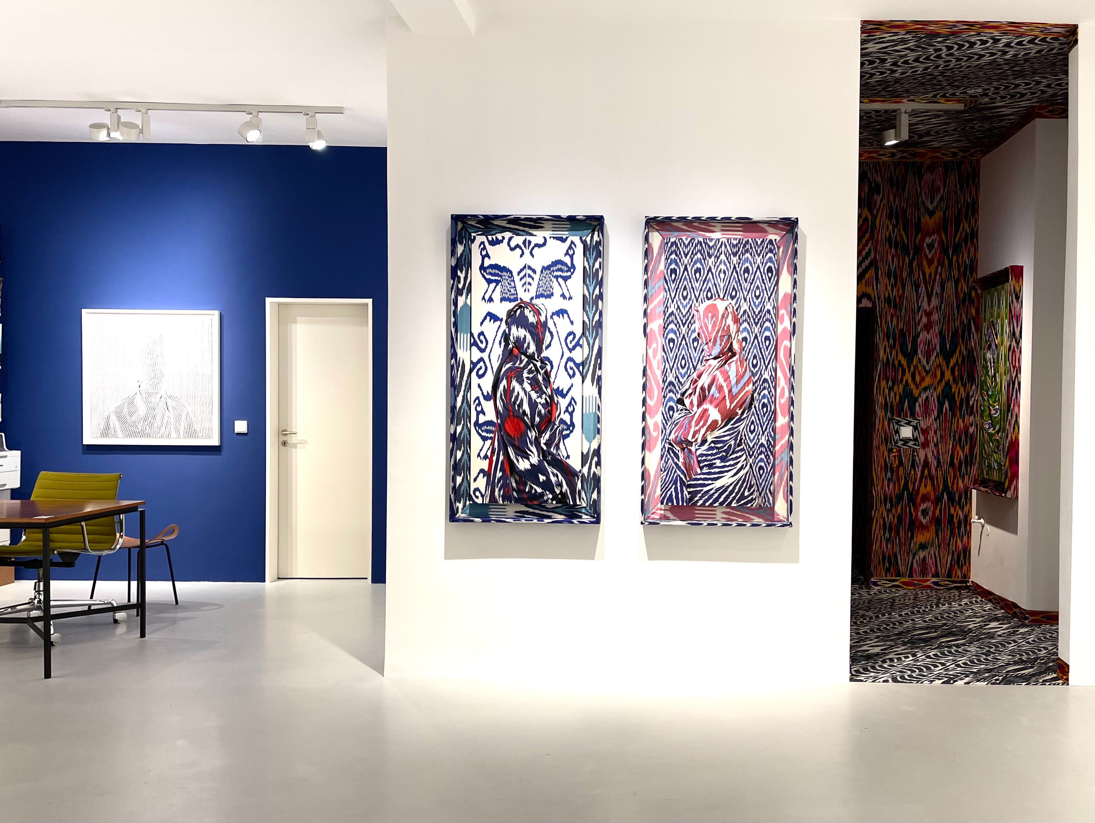 Today, Margilan is a sleepy town that attracts occasional tourists who make their way off the beaten track, away from the more renowned Samarkand and Bukhara. Its last claim to fame was in 2013, when the celebrated fashion designer Oscar de la Renta sourced fabrics here for his Fall 2013 collection. Though the kaleidoscopic designs of versicolored textiles took the fashion industry by storm, Margilan remains unchanged. The fashion industry’s appropriation of the pattern continued, while its origin was confused and co-opted as something other than Uzbek. Ikat-tiraz has been alarmingly removed from its source(s), and as such is widely recognized to be associated primarily with “Eastern'' cultures. In many instances, when searching online for example, ikat is often misattributed to Turkey or Morocco, when in fact the source lies in Uzbekistan. Ultimately, FLOW and IKATIKAT remind the viewer of where the fabric did originate, and signify the unseen master artisans themselves.