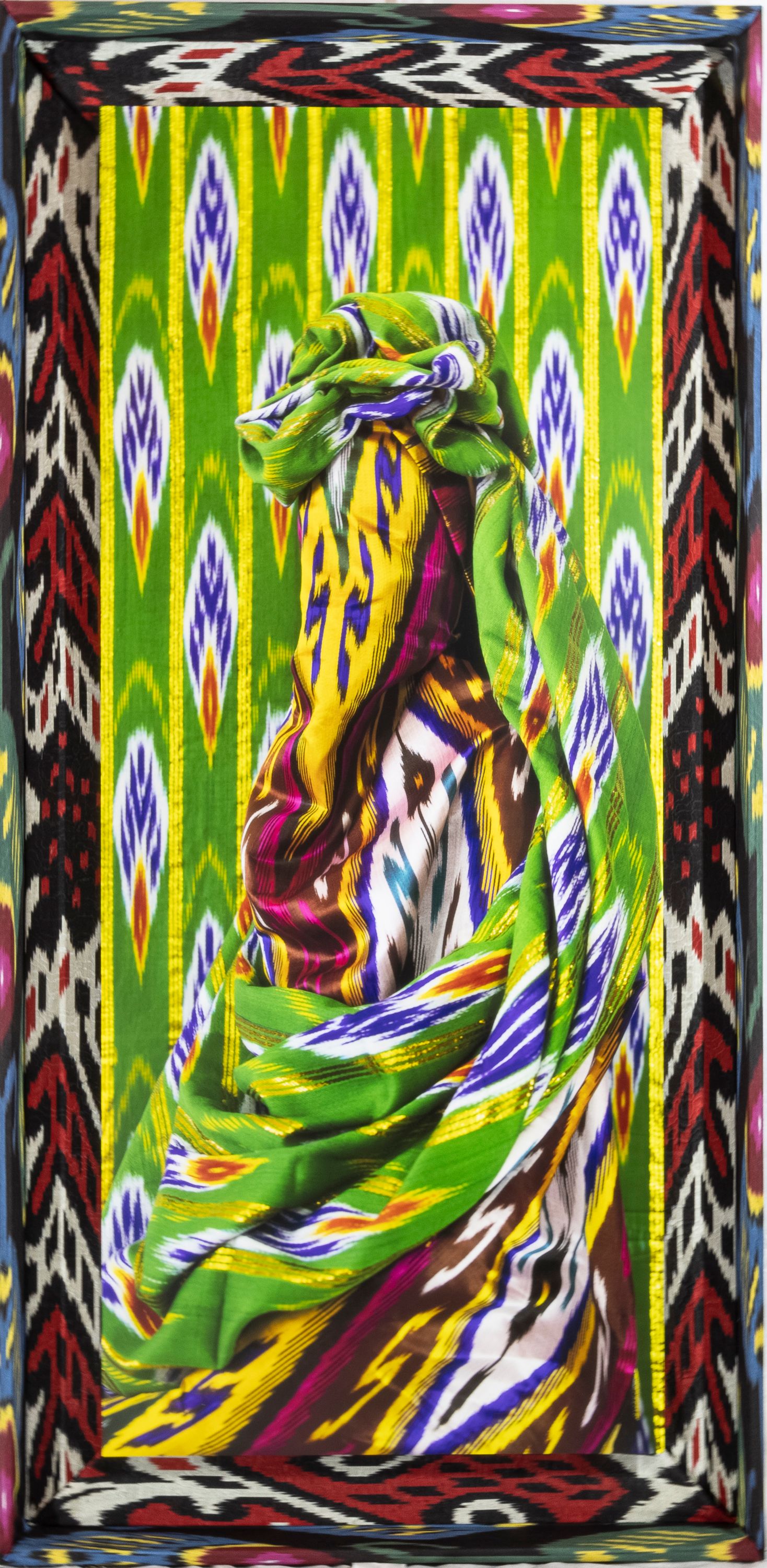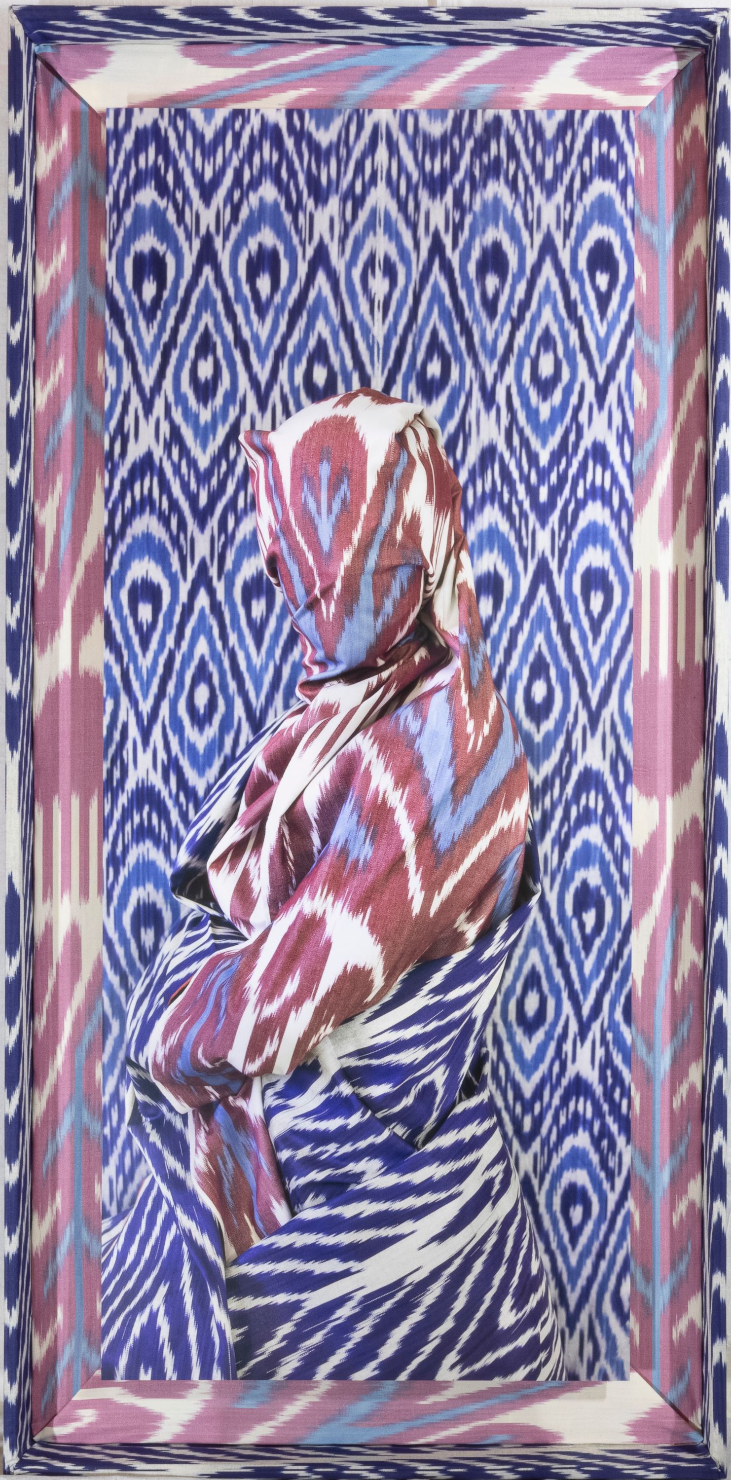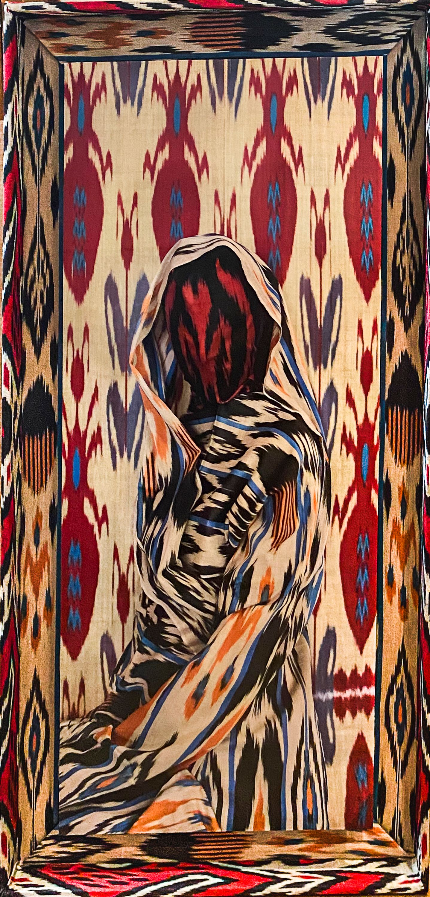 FLOW (silk & cotton, 2021) and IKATIKAT (silk velvet, 2022) are two photographic sculptural series that reference intertwining histories, cultural narratives, and creative processes associated with ikat, borrowed from the Indonesian word meaning “to bind.” While it is believed to have originated in Java, the fabric maintains roots across the globe, including India, Uzbekistan, Argentina, Bolivia, Mexico, Yemen, and Central and Southeast Asia. Around the world, ikat is known by different monikers and carries varying degrees of significance. Ikat is also known as endek to Indonesians, kasuri to the Japanese, atlas to the Uyghurs, matmi to the Thai, jaspe to Oaxaquenos, pochampally to Hydrabadis, patola to Gujaratis, darayee to Iranians, and tiraz to Yemenis. Regardless of the different names used as reference by each community, the process remains consistent. This particular cloth—considered to be one of the “holy weaves”—is regarded as a fabric for the wealthy and/or the sacred. Today it is most commonly referred to as ikat, and this name has been adopted into other Indo-European languages where the practice was never developed, but rather appropriated.